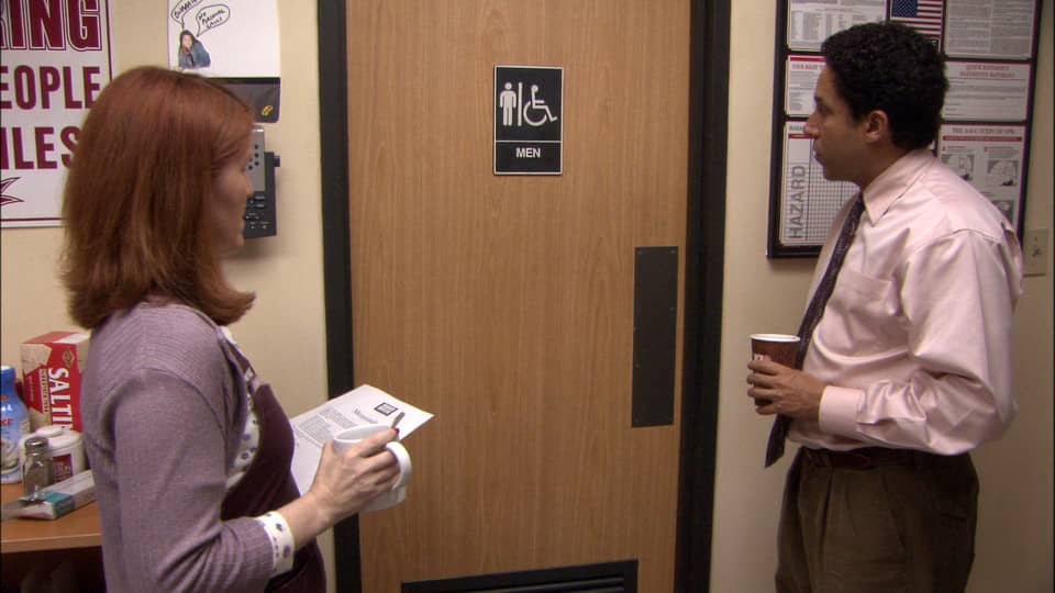 Персонажи: Майкл Скотт, Дуайт Шрут, Джим Халперт, Пэм Бисли, Райан Ховард, Энди Бернард, Стэнли Хадсон, Кевин Малоун, Мередит Палмер, Анджела Мартин, Оскар Мартинес, Филлис Вэнс.