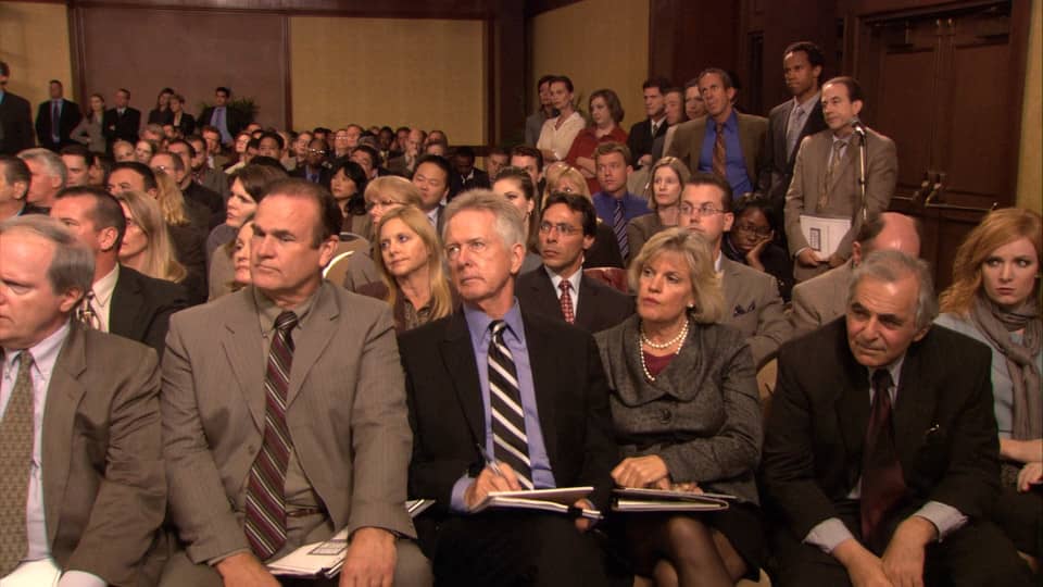 Персонажи: Майкл Скотт, Дуайт Шрут, Джим Халперт, Пэм Бисли, Райан Ховард, Энди Бернард, Стэнли Хадсон, Кевин Малоун, Мередит Палмер, Анджела Мартин, Оскар Мартинес, Филлис Вэнс.